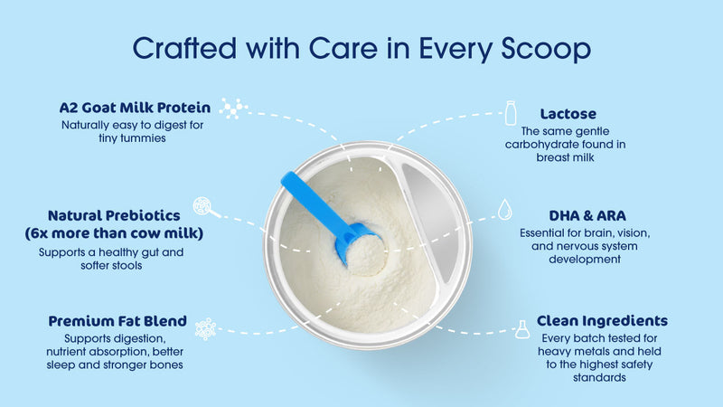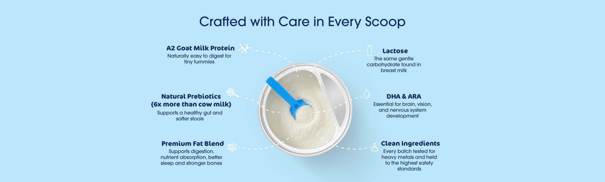 Goat milk naturally contains a higher level of A2 ß-casein proteins that are different from the A1 ß-casein proteins in cow milk. A higher proportion of A2 proteins may provide comfort and prevent tummy troubles. The naturally occurring oligosaccharides in goat milk help support a healthy gut and immune system.