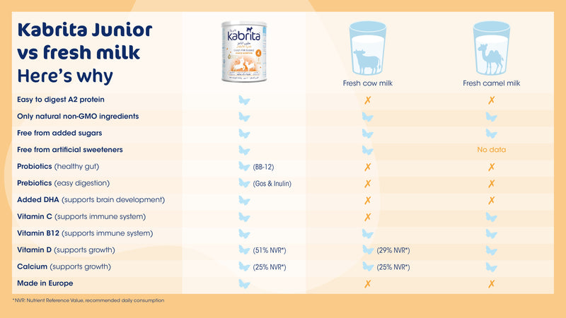 Not suitable for children below 3 years. Kabrita Junior is not a breastmilk substitute and should be used within a balanced diet from 3 to 7 years of age. Always follow the preparation instructions as mentioned on the tin. Incorrect preparation and feeding can cause risks to your child’s health.