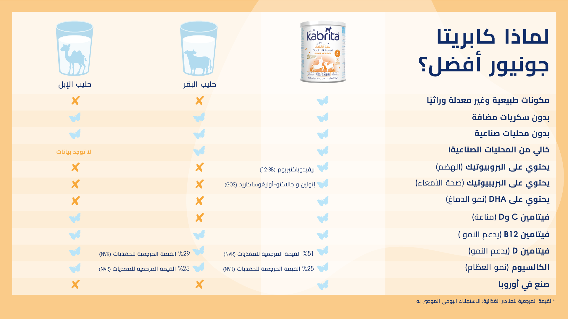 غير مناسب للأطفال دون سن ٣ سنوات. كابريميل جونيور ليس بديلا ً لحليب الأم ويجب استخدامه ضمن نظام غذائي متوازن من سن ٣ إلى ٧ سنوات. اتبعي دائما تعليمات التحضير كما هو مذكور على العلبة. قد يتسبب التحضير والتغذية غير الصحيحين في مخاطر على صحة طفلك.
